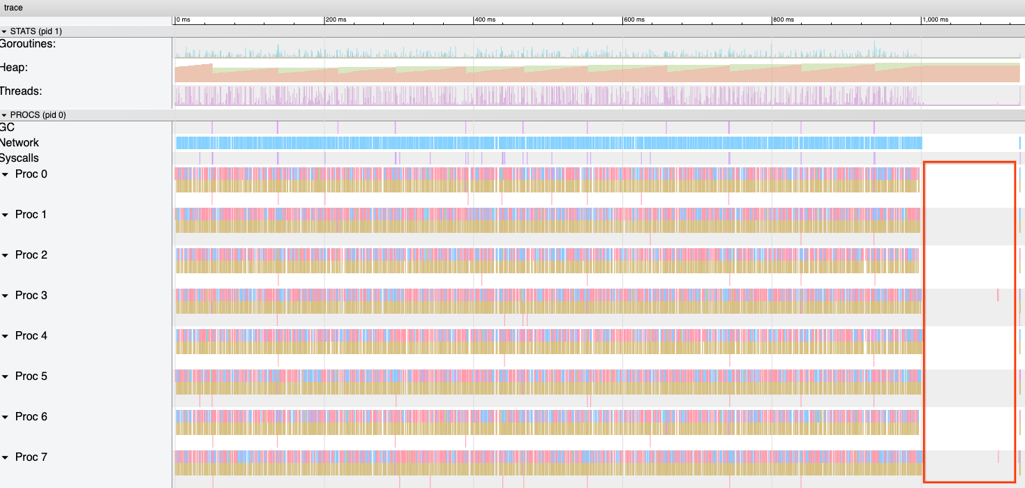 Below that, in the “PROCS” section, we can see how the execution of goroutines is mapped